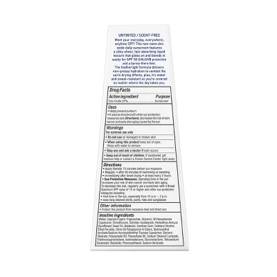 This clean 100% mineral daily sunscreen features a silky-sheer, fast-absorbing liquid texture that glides on skin and blends in easily for SPF 50 UVA/UVB protection and a barely-there feel. The featherlight formula delivers non-greasy hydration to combat the sun’s drying effects and provides 80 minutes of sweat & water resistance.