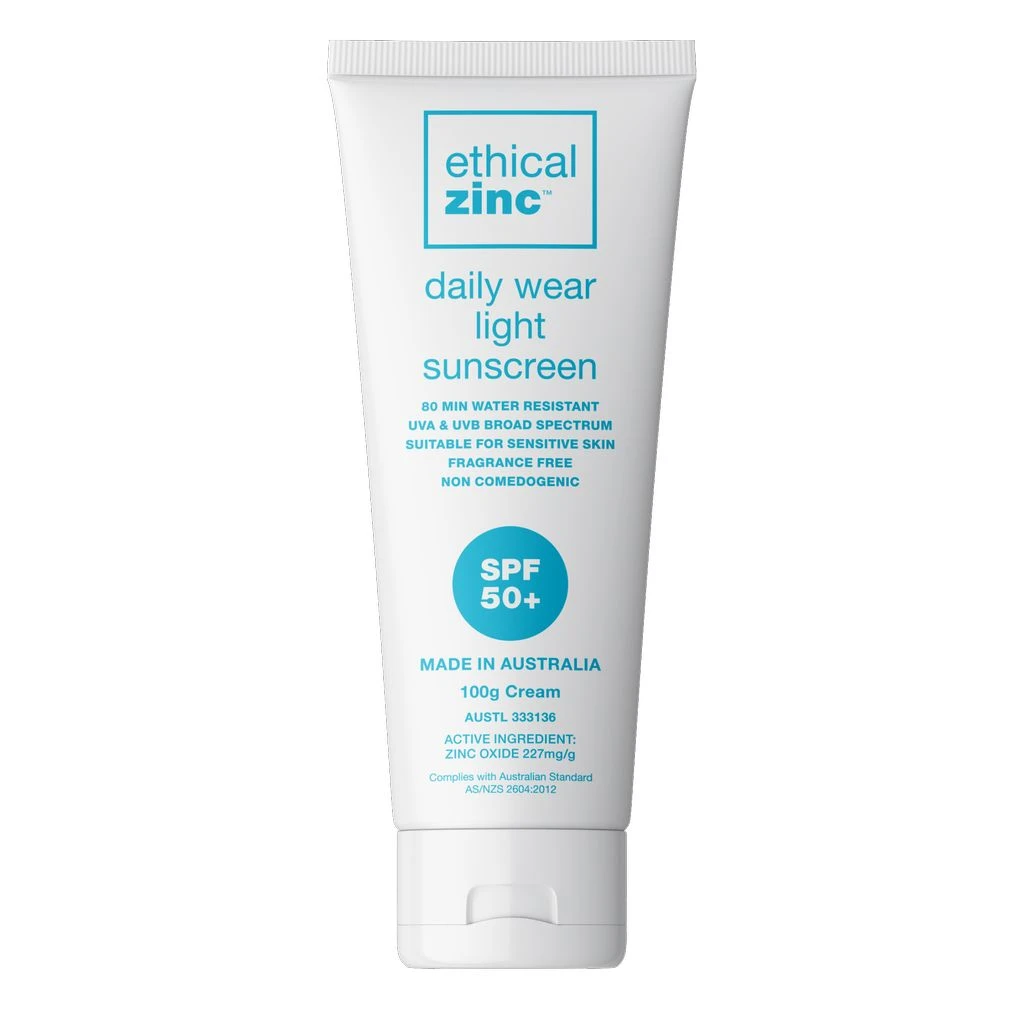 Ethical Zinc SPF50+ daily wear light sunscreen is perfect for daily wear on the face and body with an easy to apply and remove, light feel.