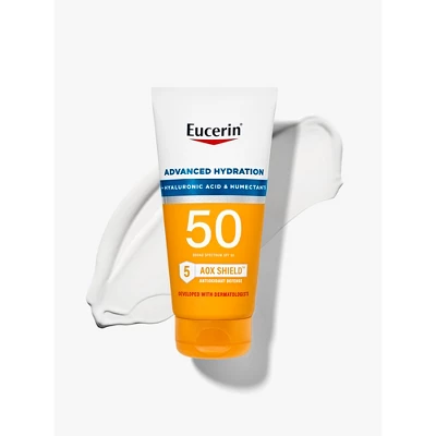 Eucerin Sun Advanced Hydration SPF 50 Sunscreen Lotion is a fragrance free sunscreen lotion formulated with Hyaluronic Acid and Humectants to attract and replenish skin’s natural moisture, leaving skin hydrated and supple for up to 8 hours. This moisturizing sunscreen features UVA/UVB sun protection plus an advanced antioxidant complex, 5 AOX Shield™, that goes beyond neutralizing to also guard from free radicals and help support skin health. Eucerin Sun Advanced Hydration Sunscreen Lotion SPF 50 dries clear; it is also water resistant (up to 80 minutes). Developed with dermatologists, this sunscreen is hypoallergenic and free of fragrance, dyes, parabens, PABA, phthalates, oxybenzone and octinoxate. This Broad Spectrum sunscreen is suitable for use as a face and body sunscreen. *with continuous use. Use as directed with other Sun Protection Measures (See Drug Facts Box)