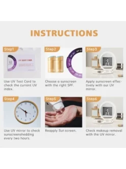 - Instructions 1. Use UV test card to check the current UV index. 2. Choose a sunscreen with the right SPF. 3. Apply sunscreen effectively with our UV mirror. 4. Use UV mirror to check sunscreenshedding every 2 hours. 5. Reapply sunscreen. 6. Check makeup removal with UV mirror.