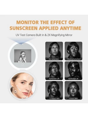 - Monitor the effect of sunscreen applied anytime. UV test camera built in & 2x magnifying mirror.